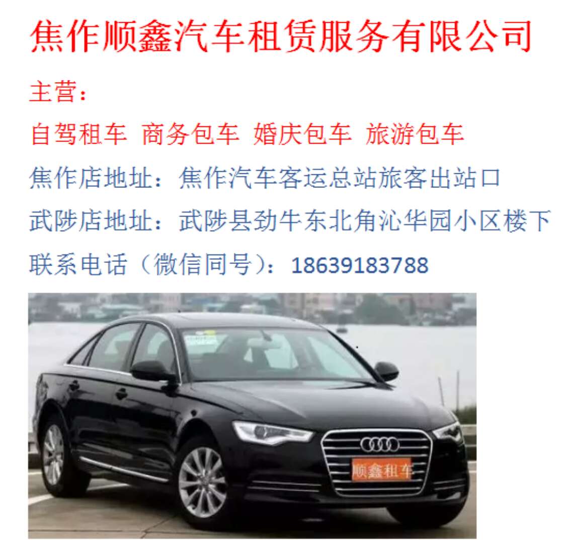 服務(wù)描述 焦作順鑫汽車租賃服務(wù)有限公司,專業(yè)提供自駕租車、配駕租車、婚慶租車、商務(wù)旅游包車等全面車輛服務(wù)。先后榮獲河南省汽車租賃行業(yè)示范單位和河南省十佳誠信經(jīng)營先進(jìn)單位稱號(hào)。公司秉承安全、高效、快捷、周到的服務(wù)理念,全年無休7*24小時(shí)竭誠期待...